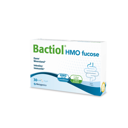- Bactiol® HMO fucose besteht aus 2 Blistern: 1 Blister mit 2'-Fucosyllactose und L-Threonin und ein 2. Blister mit Kapseln, die 15 Milliarden lebende Bakterien und Vitamin D enthalten