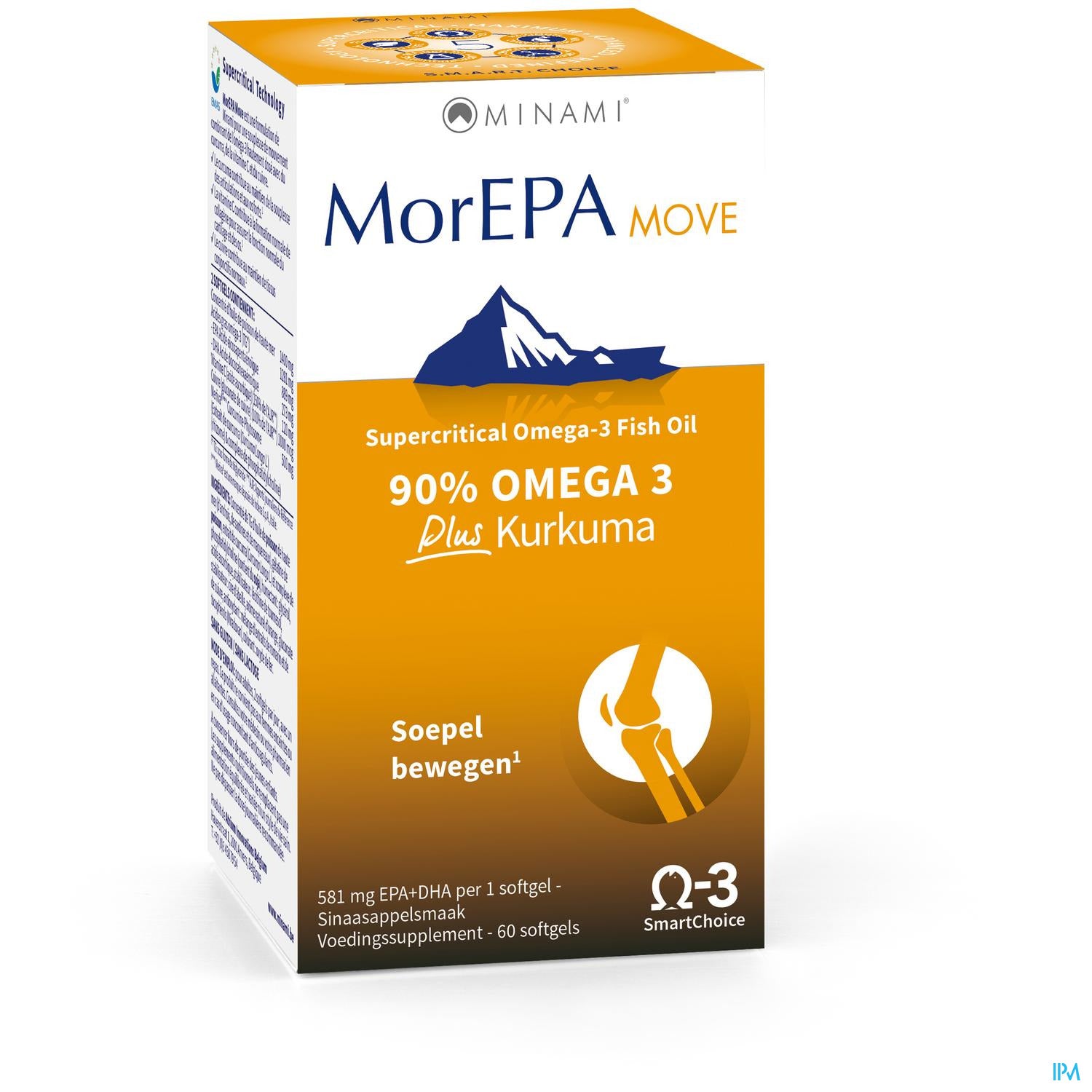 MorEPA Move is a Minami formulation for supple movement combining high-dose (90%) omega-3 (445 mg EPA + 136 mg DHA) with turmeric, vitamin C and copper.